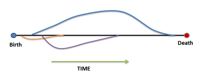 The adjacent figure describes it more clearly. The coloured lines diverging from the straight solid black line are your life paths that you chose at your own will by making decisions. The more decisions you make, the more diverging lines you will create. But these lines ultimately meet the center black line before the end of life.